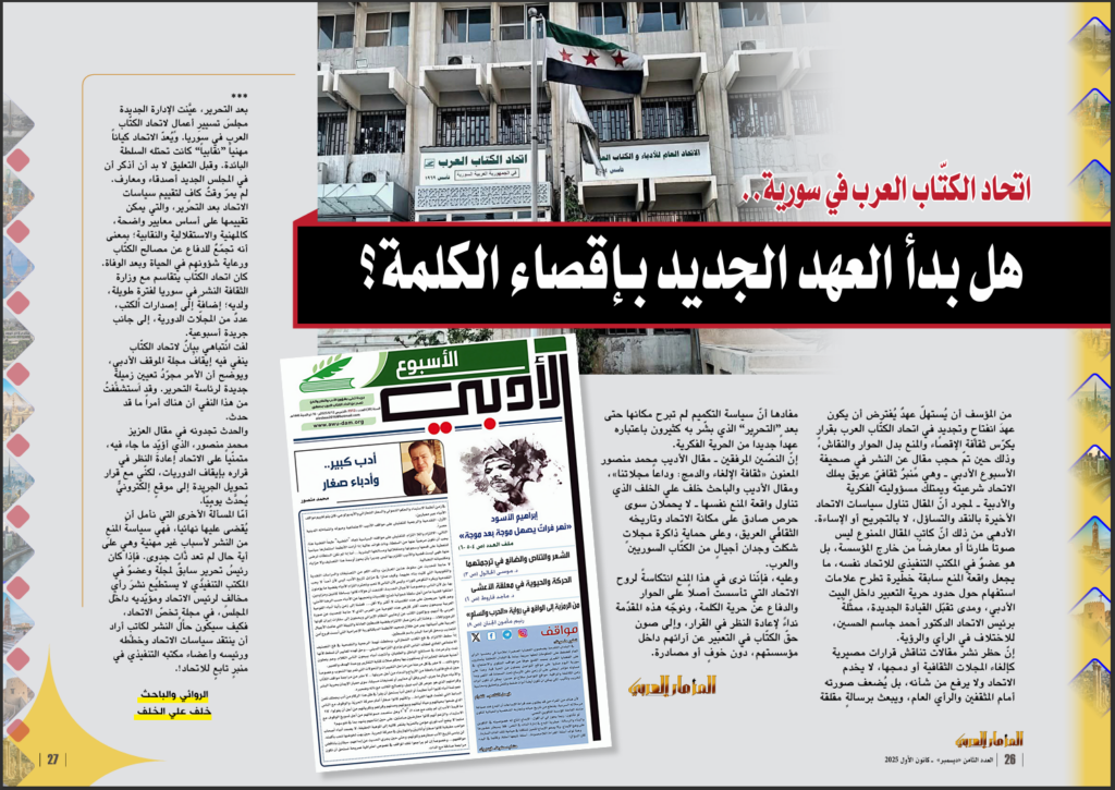إنّ حظر نشر مقالات تناقش قرارات مصيرية كإلغاء المجلات الثقافية أو دمجها، لا يخدم الاتحاد ولا يرفع من شأنه، بل يُضعف صورته أمام المثقفين والرأي العام، ويبعث برسالةٍ مقلقة مفادها أنّ سياسة التكميم لم تبرح مكانها حتى بعد “التحرير” الذي بشّر به كثيرون باعتباره عهداً جديداً من الحرية الفكرية.