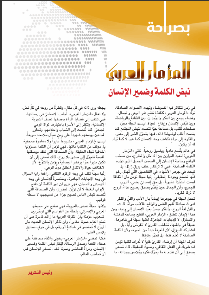 في عالمٍ يتّسع مادياً ويضيق روحياً، تأتي «المزمار العربي» لتعيد التوازن بين الداخل والخارج، بين صخب الواقع وحاجة الإنسان إلى الصمت الجميل الذي تولده الكلمة الصادقة. فهي لا تركض خلف بريقٍ زائل، بل تبحث في جوهر الأشياء، في التفاصيل التي تُهمَل رغم أنّها تصنع وجودنا الحقيقي. إنها مجلةٌ تؤمن بأن الثقافة ليست امتيازاً نخبوياً، بل حقّ إنسانيّ يضيء الدرب للجميع، وأن الجمال حين يُقدَّم بصدق يصبح غذاءً للروح لا ترفاً فكرياً.