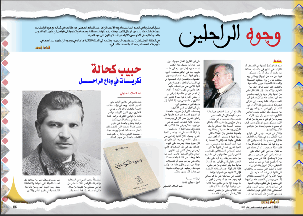 حين بلغني في مقامي البعيد نعي الحبيب الفقيد، وبعد أن تولت لحظات الغصة بالدهشة واللوعة، مرت في خاطري مرور البرق ذكريات مراحل ثلاث من أيامي الغابرة. مراحل ثلاث متباعدة في سياق الزمن ولكنها مرتبطة بذكرى واحدة هي ذكرى حبيب كحالة ومجلته التي كانت وظلت تحمل اسمه مثلما تحمل روحه، مجلة “المضحك المبكي”. وأنا إذ أكتب هذه الكلمات متحدثاً عن حبيب كحالة، متبسطاً بعض الشيء في استعادة وقائع تلك المراحل الثلاث اعتذر من قرائي لتحدثي عن فقيدنا من خلال ذكريات شخصية. فما شخصياتنا غير عدسات مكثفة تمر من خلالها كل أحداث الحياة التي نحياها وانفعالاتنا منها، ومن العبث الهروب من تأثراتنا الشخصية في تقييم الناس والأمور وفي معرفة الحقائق. فما من قيمة مطلقة ولا من رأي تام الموضوعية في هذا الكون مادامت أشخاصنا هي الطريق الحتمية لكل محاكمة ولكل معرفة.