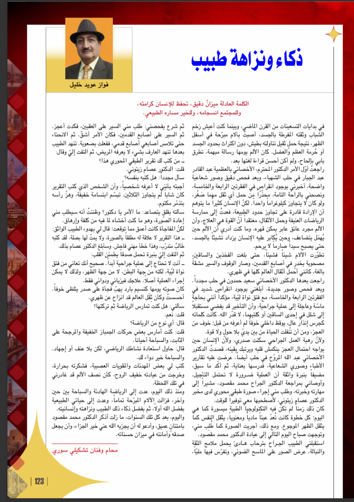ومنذ ذلك اليوم، عدت إلى الرياضة الهادئة والسباحة بين حين وآخر، فزالت الآلام المبرّحة تماماً، وعدت إلى حياتي الطبيعية بفضل الله أولاً، ثم بفضل ذكاء ذلك الطبيب ونزاهته وإنسانيته.