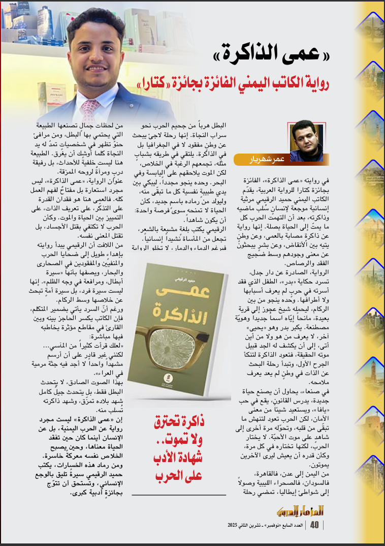 في روايته «عمى الذاكرة»، الفائزة بجائزة كتارا للرواية العربية، يقدّم الكاتب اليمني حميد الرقيمي مرثية إنسانية موجعة لإنسانٍ سُلب ماضيه وذاكرته، بعد أن التهمت الحرب كل ما يمتّ إلى الحياة بصلة. إنها رواية عن ذاكرةٍ مصابة بالعمى، وعن وطنٍ يتيه بين الأنقاض، وعن بشرٍ يبحثون عن معنى وجودهم وسط ضجيج الفقد والرصاص.