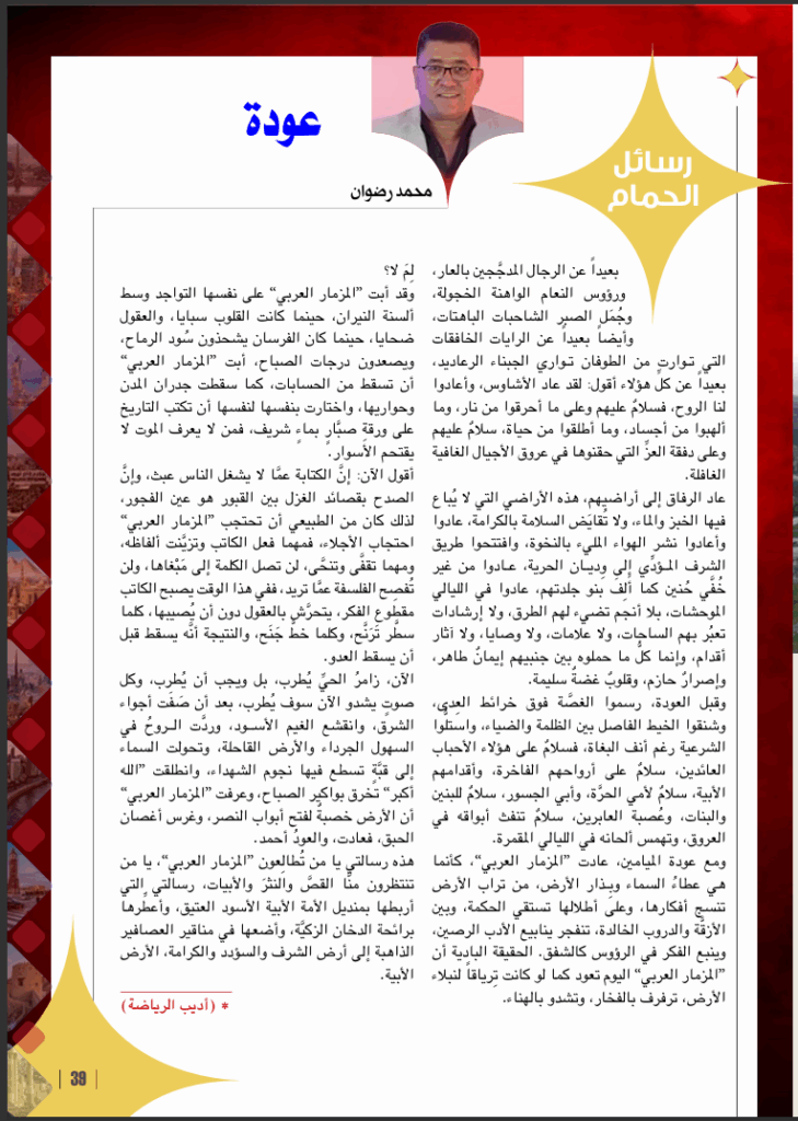 ومع عودة الميامين، عادت “المزمار العربي”، كأنما هي عطاءُ السماء وبِذار الأرض، من تراب الأرض تنسج أفكارها، وعلى أطلالها تستقي الحكمة، وبين الأزقَّة والدروب الخالدة، تنفجر ينابيع الأدب الرصين، وينبع الفكر في الرؤوس كالشفق. الحقيقة البادية أن “المزمار العربي” اليوم تعود كما لو كانت تِرياقاً لنبلاء الأرض، ترفرف بالفخار، وتشدو بالهناء.