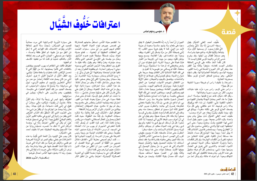 اعترافٌ رابع: ليس لي زوجةٌ ولا أولادٌ، ولم أكوِّنْ عائلةً، خشيتُ أن يكونوا” شيَّالين” مثلي، وحاذرْ أن تقول لي إنَّني كنتُ “شجاعاً” بل كنتُ جباناً، رجلٌ هشٌّ ربَّما يبحثُ عن اعترافٍ ما، أو يكفِّرُ عن شيءٍ ما، حتى الصَّوت الذي أكَّدَ المُحقِّقُ ذلك الشَّاب الصَّغير الذي يقفز من زاوية إلى أخرى في مكتبه الكبير المُزَّين بالعلمِ الوطنيِّ المكويِّ جيداً، إنَّه لي في تسجيلٍ عَرَضَه ُعليَّ، لم يكنْ لي، لكنَّني اعترفتُ بأنَّه لي، وعندما أدركتُ أنني لا أملك ما أخسره، نَسَجْتُ روايةً عن هذا التَّسجيلِ وظروفه البطولية، نعم أنا خلُّوف أحمد علي “الشيَّال”.
