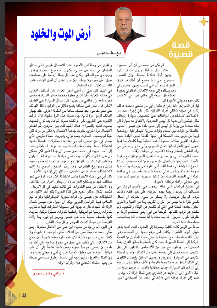 في اليوم التالي جاءني صوت ابن عمي من الداخل مخنوقاً، وهو يبكي: “ضاعت جثة عمي بين أشلاء القتلى، لم نجد لا تابوتاً، ولا كفناً، عمي مات مرة ثانية، لكن هذه المرة سقط شهيداً بين جمع من الأشلاء، التي دُفنت على عجل في مقبرة جماعية على أطراف بلدة عين عيسى، ثم بدأ صوته يخفت شيئاً فشيئاً إلى أن غاب نهائياً، أعقبه صمت مطبق، ثم بداً صراخ أمي وإخوتي يعلو، وما بين البكاء والعويل، رأيت وجه أبي باسماً، وطرق مسامعي صوته من بعيد: ستملأ أشلائي هواء وتراب الرّقة.