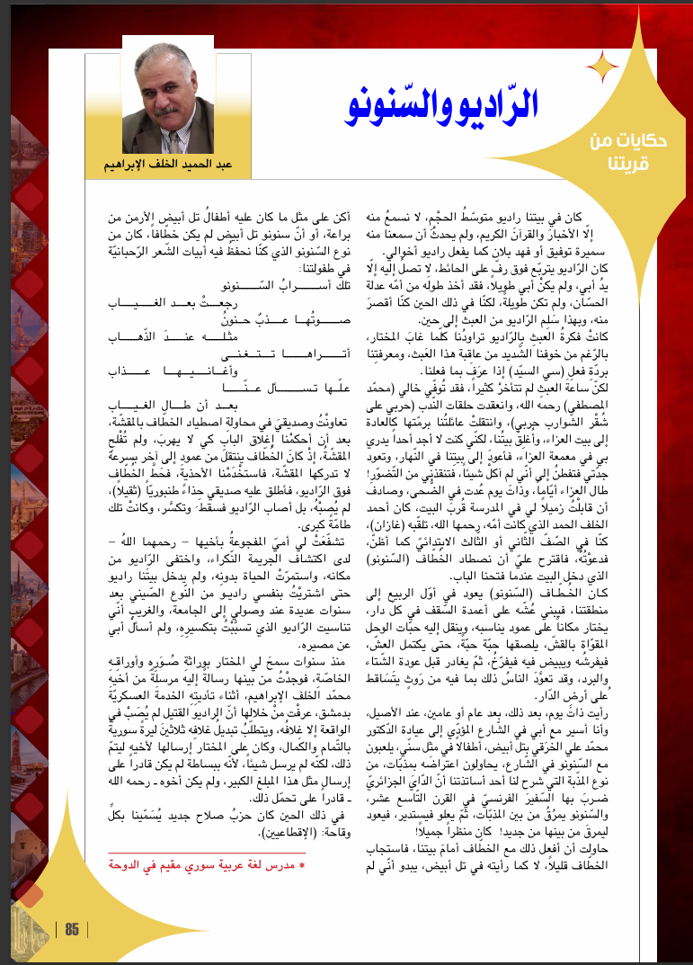 كان الرّاديو يتربّع فوق رفّ على الحائط، لا تصلُ إليه إلّا يدُ أبي، ولم يكنْ أبي طويلاً، فقد أخذ طولَه من أمّه عدلة الحسّان، ولم تكن طويلةً، لكنّا في ذلك الحين كنّا أقصرَ منه، وبهذا سَلِم الرّاديو من العبث إلى حين.