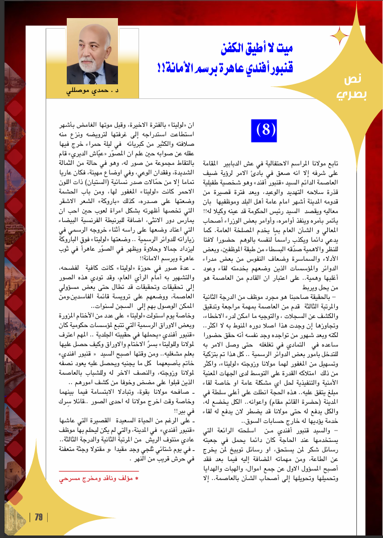 -والسيد قنبور أفندي من  اسلحته الرائعة التي يستخدمها عند الحاجة كان دائما يحمل في جعبته رسائل شكر لمن يستحق ، او رسائل توبيخ لمن يخرج عن الطاعة، ومن مهماته المضافة إليه فيما بعد فقد أصبح المسؤول الاول عن جمع اموال ، والهبات والهدايا وتحميلها وتحويلها إلى أصحاب الشأن بالعاصمة.. إلا ان ” لوليتا” بالفترة الاخيرة ، وقبل موتها الغامض بأشهر استطاعت استدراجه إلى غرفتها لترويضه ونزع منه صلافته و الكثير من كبريائه  في ليلة حمراء خرج فيها عقله عن صوابه حين علم ان المصوّر “عيّاش الديري” قام بالتقاط مجموعة من صور له، وهو في حالة من الثمالة الشديدة، وفقدان الوعي، وفي اوضاع مهينة، فكان عاريا تماما إلا من حمّالات صدر نسائية ( الستيان ) ذات اللون الاحمر كانت “لوليتا” المغفور لها، ومن باب الحشمة وضعتها على صدره ، كذلك “باروكة” الشعر الاشقر التي تخصها أظهرته بشكل امراة لعوب حين احب ان يمارس دور الانثى، اضافة للبرنيطة الفرنسية البيضاء التي اعتاد وضعها على راسه أثناء خروجه الرسمي في زياراته للدوائر الرسمية .. وضعتها “لوليتا” فوق الباروكة ليزداد جمالا وحلاوةً ويظهر في الصوّر عاهرأً في ثوب عاهرة وبرسم الامانة !!