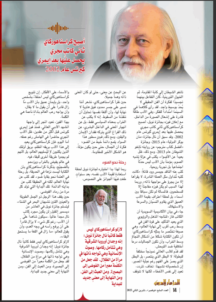 ربما لهذا بدا اختياره لجائزة نوبل لحظة استعادةٍ لقيمة الأدب نفسه، بعد سنواتٍ طغت فيها الجوائز على النصوص، والأسماء على الأفكار. إن تتويج كراسناهوركاي ليس احتفاءً بشخصٍ واحد، بل بإيمانٍ عميق بأن الأدب ما زال قادراً على أن يقول ما لا يقال، وأن يواجه رعب العالم بأداةٍ ناعمة هي الكلمة.