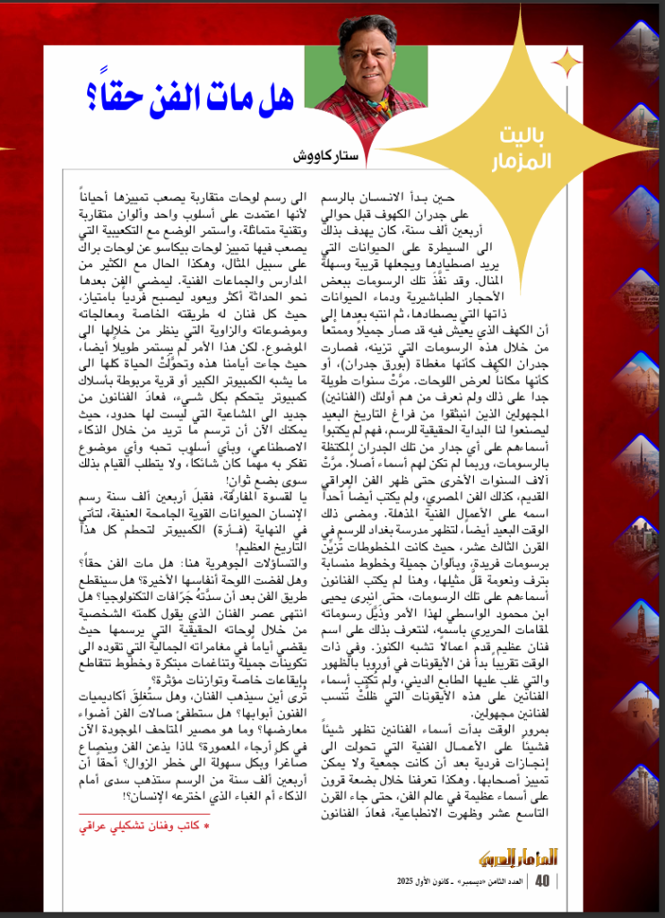 تُرى أين سيذهب الفنان، وهل ستُغلِقَ أكاديميات الفنون أبوابها؟ هل ستطفئ صالات الفن أضواء معارضها؟ وما هو مصير المتاحف الموجودة الآن في كل أرجاء المعمورة؟ لماذا يذعن الفن وينصاع صاغراً وبكل سهولة الى خطر الزوال؟ أحقاً أن أربعين ألف سنة من الرسم ستذهب سدى أمام الذكاء أم الغباء الذي اخترعه الإنسان؟!