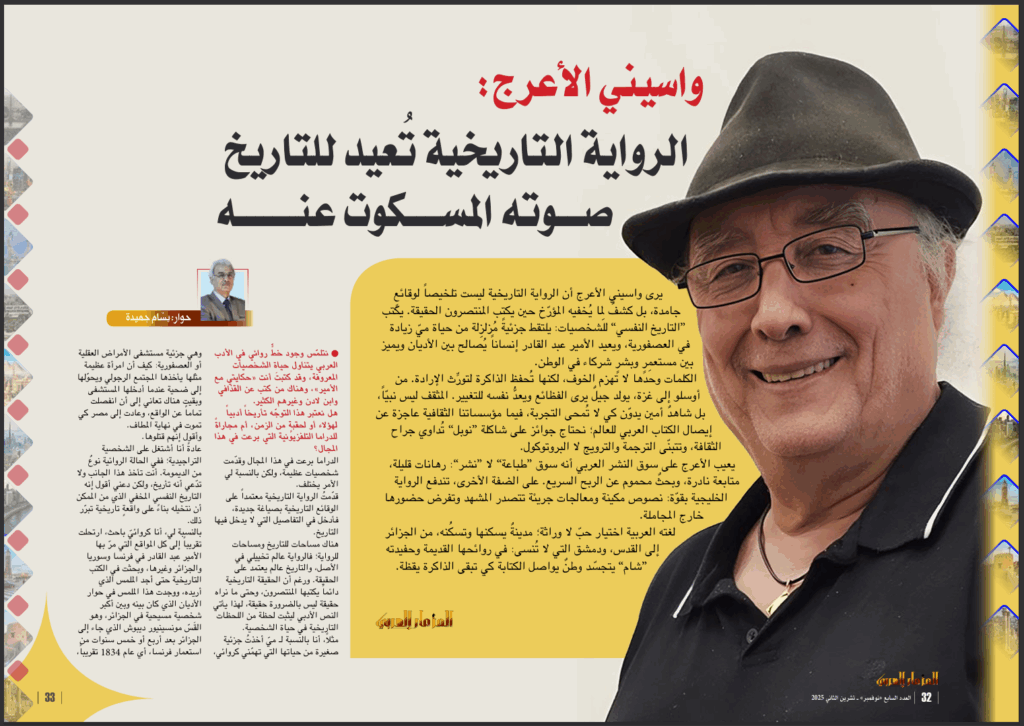 يرى واسيني الأعرج أن الرواية التاريخية ليست تلخيصاً لوقائعٍ جامدة، بل كشفٌ لِما يُخفيه المؤرّخ حين يكتب المنتصرون الحقيقة. يكتب “التاريخ النفسي” للشخصيات: يلتقط جزئيةً مُزلزِلة من حياة ميّ زيادة في العصفورية، ويعيد الأمير عبد القادر إنساناً يُصالح بين الأديان ويميز بين مستعمِرٍ وبشرٍ شركاء في الوطن.