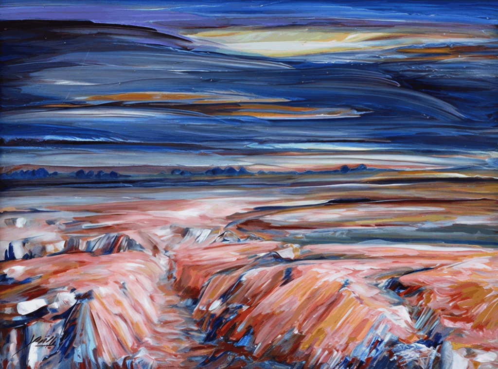 يرسم الفنان الحقول والأحراش، الأحجار والأغصان ولون أبوقرعون وأطياف الأقحوان، وكل الزهور المتخيلة والأحجار الملونة بأطيافها المتعددة وظلالها المتدرجة، يرسم شواطئ بلا عناوين، أمواجاً تلفظ أنفاسها على رمال ساطعة شديدة البياض، وآفاقاً دون أسقف، وسحباً بيضاء وظلالها الأرجوانية. يلقي اللقاء عند مناطق احمرار شفق النهايات بين السماء والأرض، وعلى حواف مساحات مرسومة كأنها صحارٍ زرقاء تموج كثبانها الهائجة في اضطراب لا تستكين فيها روح الرائي ولا تستقر.