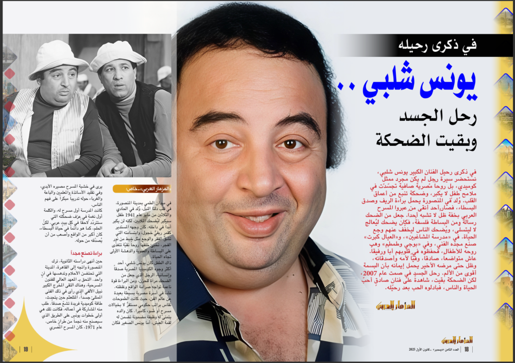 بعد مرور أكثر من ثمانية عشر عاماً على رحيله، ما زال اسم يونس شلبي يُذكر بمحبة صافية. لم يكن مبدعاً من النوع المتكبّر، بل كان من أولئك الذين يجعلون الفن أقرب إلى الناس.