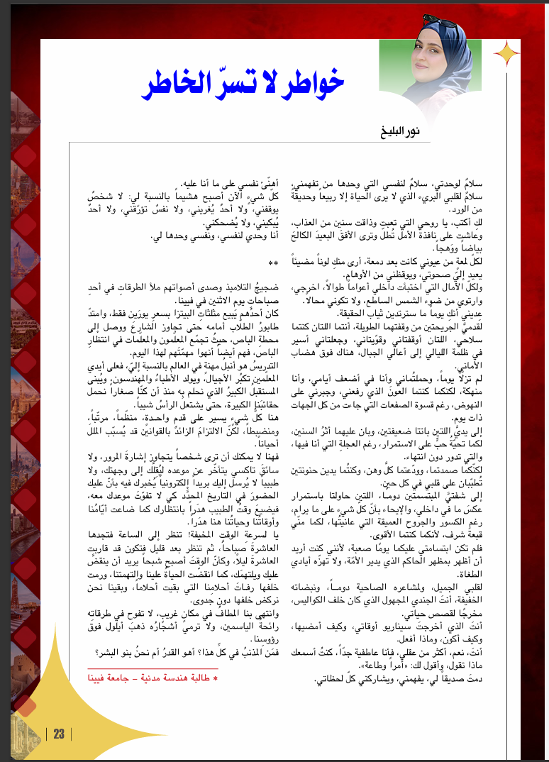 نور البليخ سلامٌ لوحدتي، سلامٌ لنفسي التي وحدها من تفهمني، سلامٌ لقلبي البريء الذي لا يرى الحياة إلا ربيعاً وحديقةً…